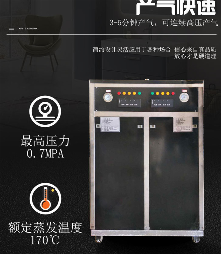 1、新型蒸汽发生器以电能作为能源、无噪音、绝无污染,是一款绿色环保类产品。