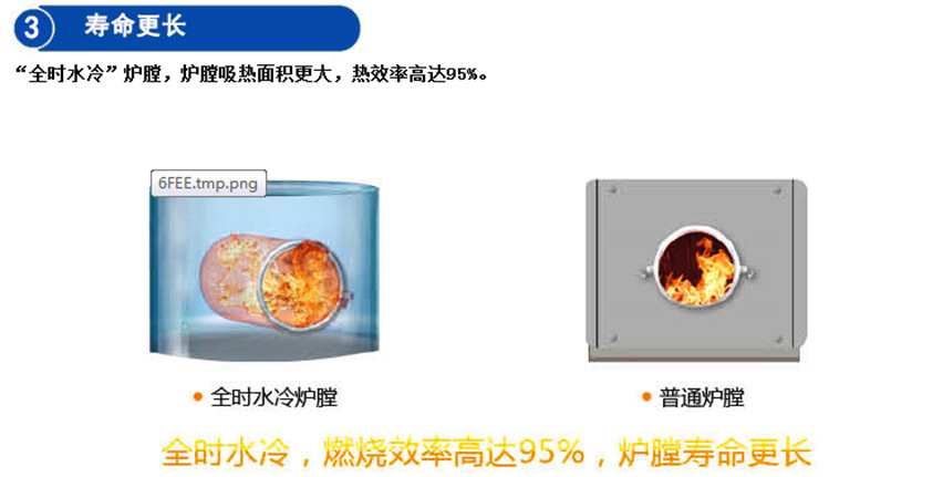3、“全时水冷”炉膛,燃烧效率高达95%,炉膛寿命更长。